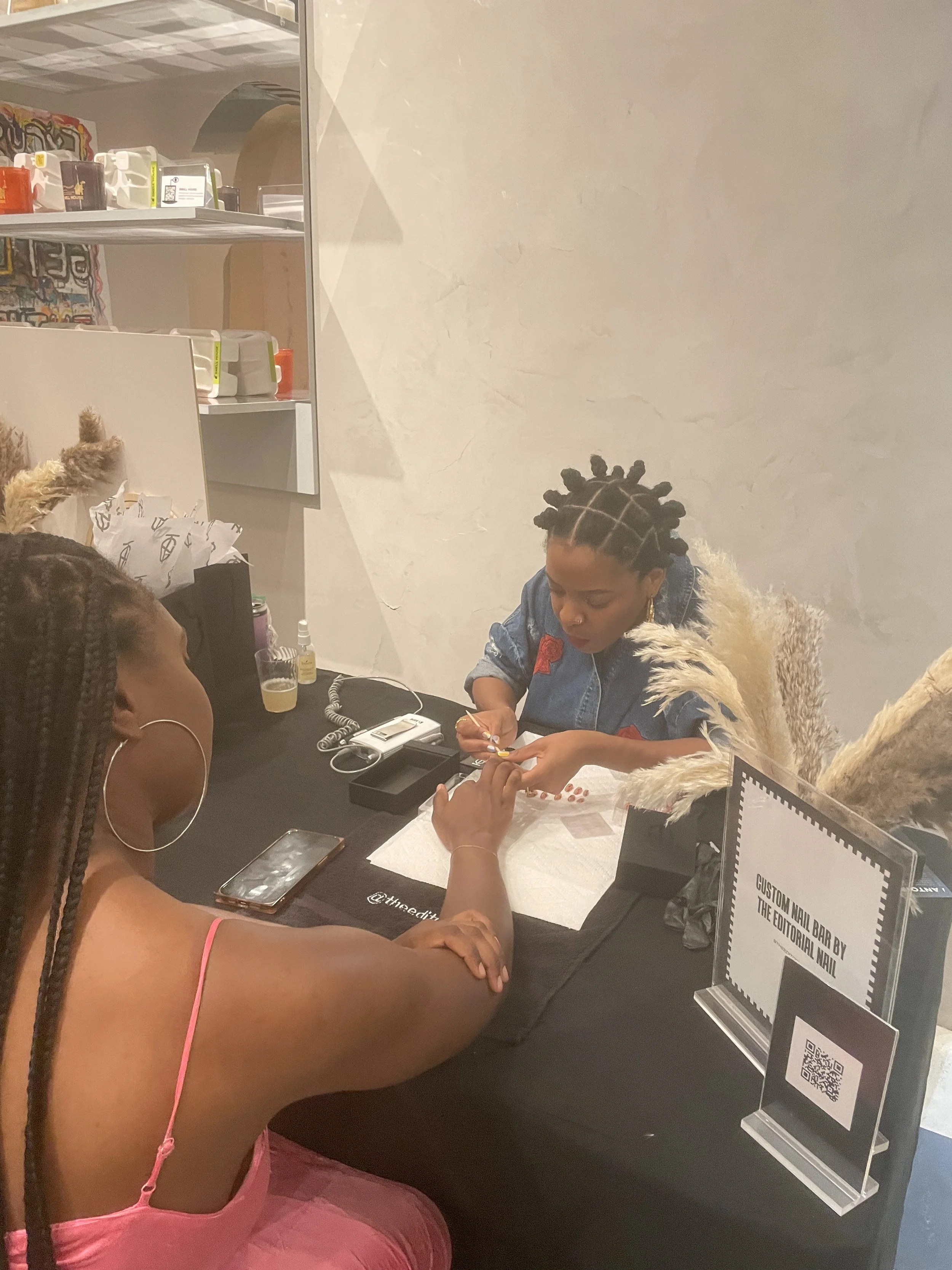 "Step into a blissful celebration of Black excellence at our "Still and Softness" event, where beauty, relaxation, and art intertwine to create an unforgettable experience. Enjoy our custom nail art bar featuring captivating Black-centric designs while indulging in a relaxing beverage. Participate in a intuitive fragrance-making workshop, where you'll embark on a sensory adventure and create your signature scent. Lastly, explore our curated exhibition showcasing emerging Black and African artists and their depiction of the Black experience."