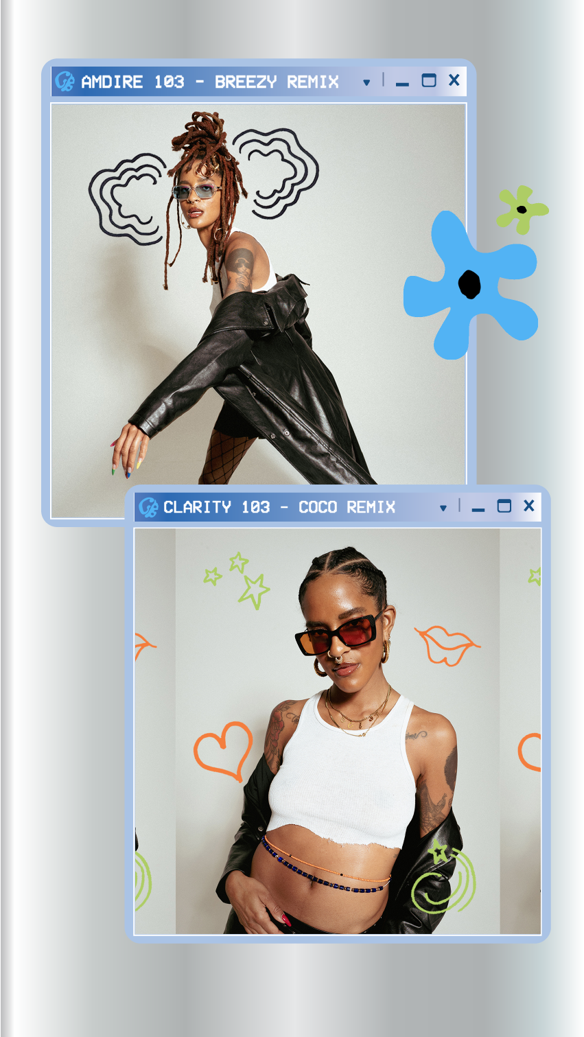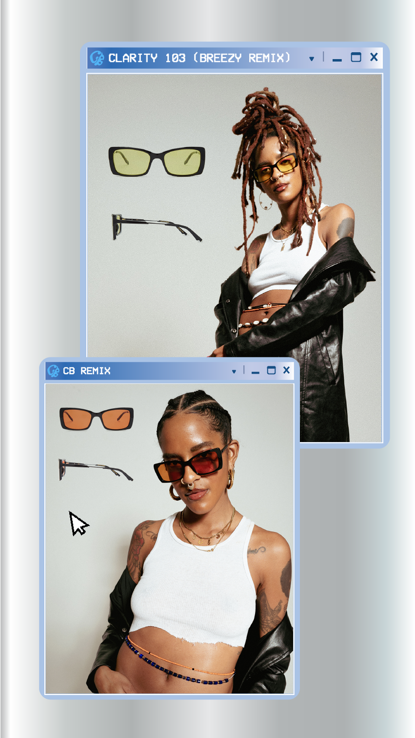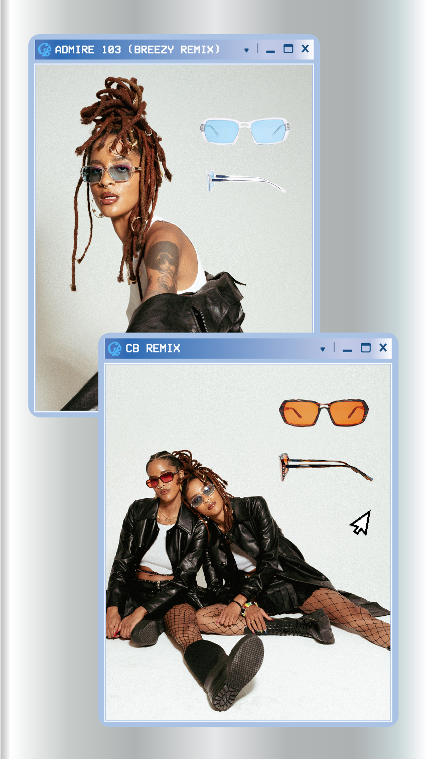 CB Remix is a time capsule meets treasure trove of hand selected Coco and Breezy frames with a groovy new limited edition spin. Founders and DJ/Producer sister duo Coco and Breezy have selected three classic frames to “remix”; each twin adding their own twist to the frame and lens colour. Inspired by their love for music and authentic self-expression, Coco and Breezy offer you a fresh new look into their individual personalities. Coco’s Clarity 103 remix with its warm amber lens, embodies a feeling of safety, confidence and nurturing care. Breezy’s Admire 103 remix sees the world through sky blue colored lenses, tapping into one’s intuition, inspiring you to live in a world of your own imagination. Developed with their younger selves in mind, the collection breathes early 2000’s nostalgia; remixes of your favorite radio hits, music videos that transport you to a world of cyber futurism, and burning CD’s with your favorite songs. This particular playlist is a story of evolution. This collection flourished from a space of reflection, looking back at the inception of Coco and Breezy Eyewear in 2009 and acknowledging a triumphant journey through self-realization.